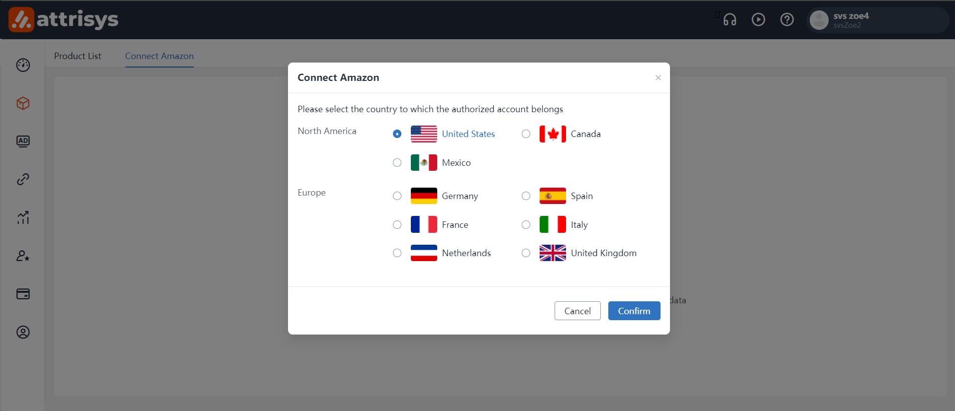 &#x20;Select the country for the Amazon account you wish to link.